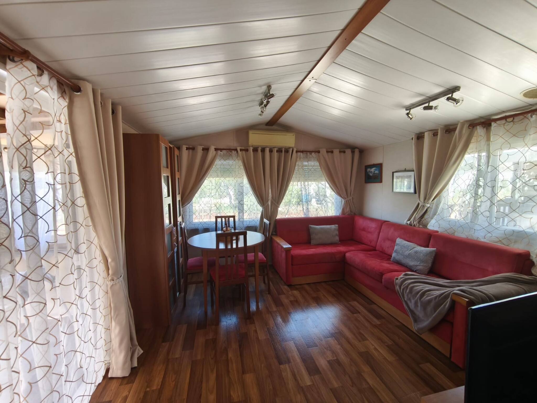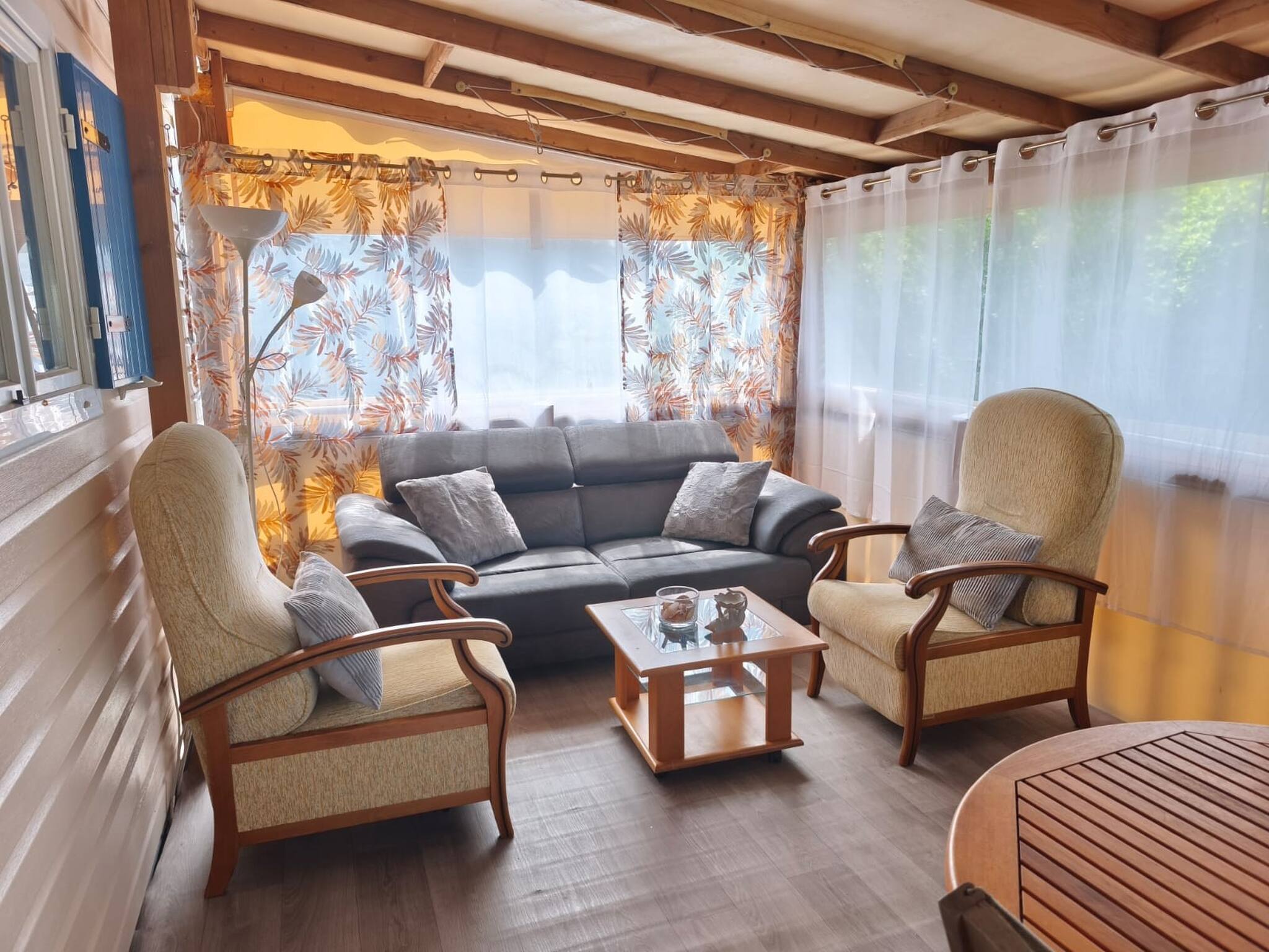 Mobil-home tout équipé ,climatisé de 42m2 avec une grande terrasse climatisée aussi couverte et décorée avec soin pour vous accueillir vous et votre famille , avec jardin clôturer , barbecue et mobilier son à votre disposition pour vous détendre et profiter. Une place de parking est réservée pour votre véhicule. le Mobil home est prévu pour 6 personnes. Salon panoramique,canapé convertible 2p, avec tv,Wi-Fi gratuit,cuisine équipée,2 chambres dont 1 attenante à la SAB, toilette séparée.