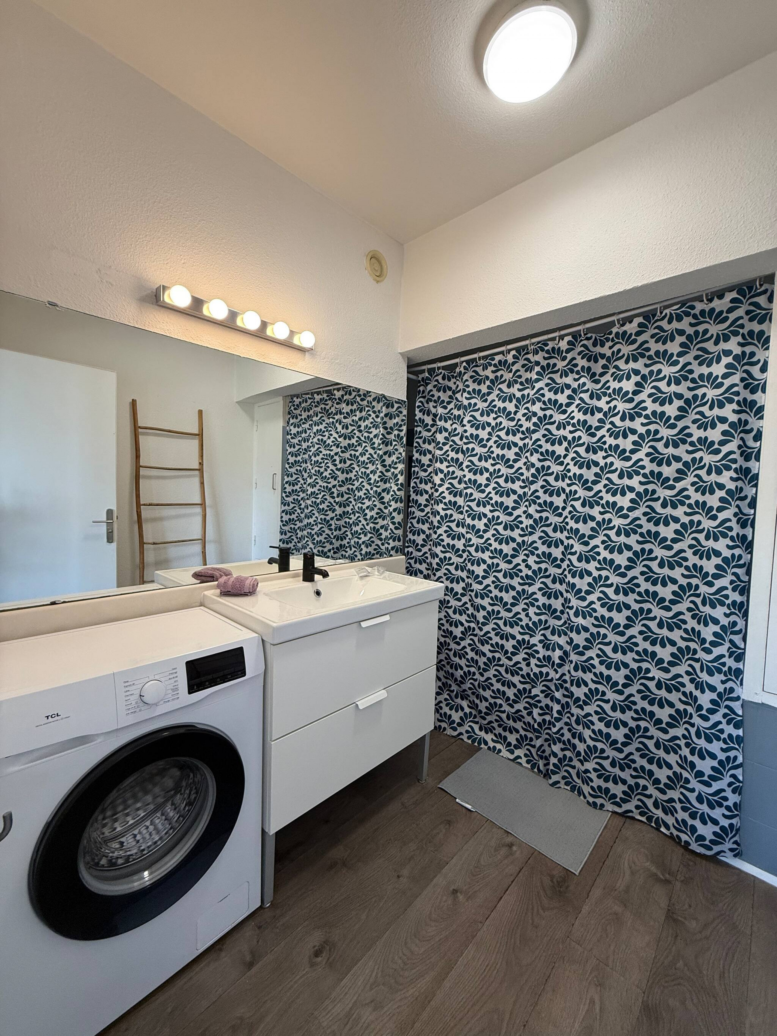 El baño cuenta con una bañera y una lavadora.