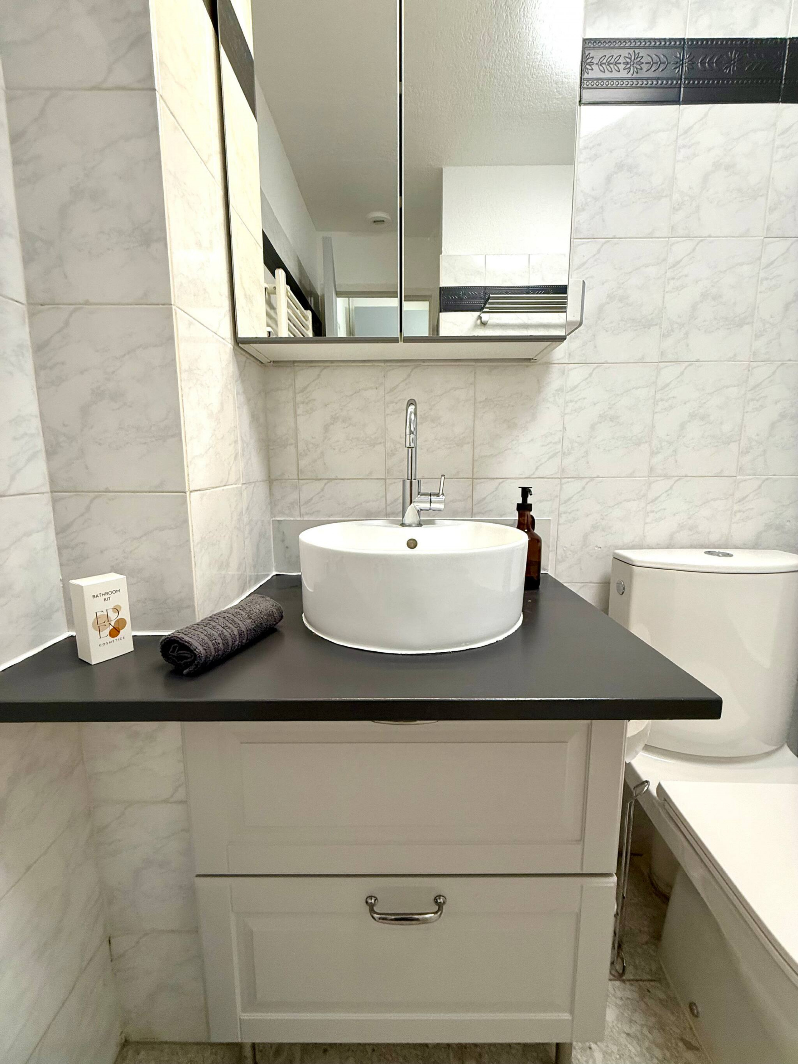 Baignoire, vasque moderne, rangements et WC.