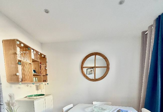 Le salon-séjour est baigné de lumière grâce à sa grande baie vitrée donnant sur le jardinet. Vous y trouverez un canapé convertible pour deux personnes, un coin repas convivial, et une télévision connectée pour vos soirées cocooning.