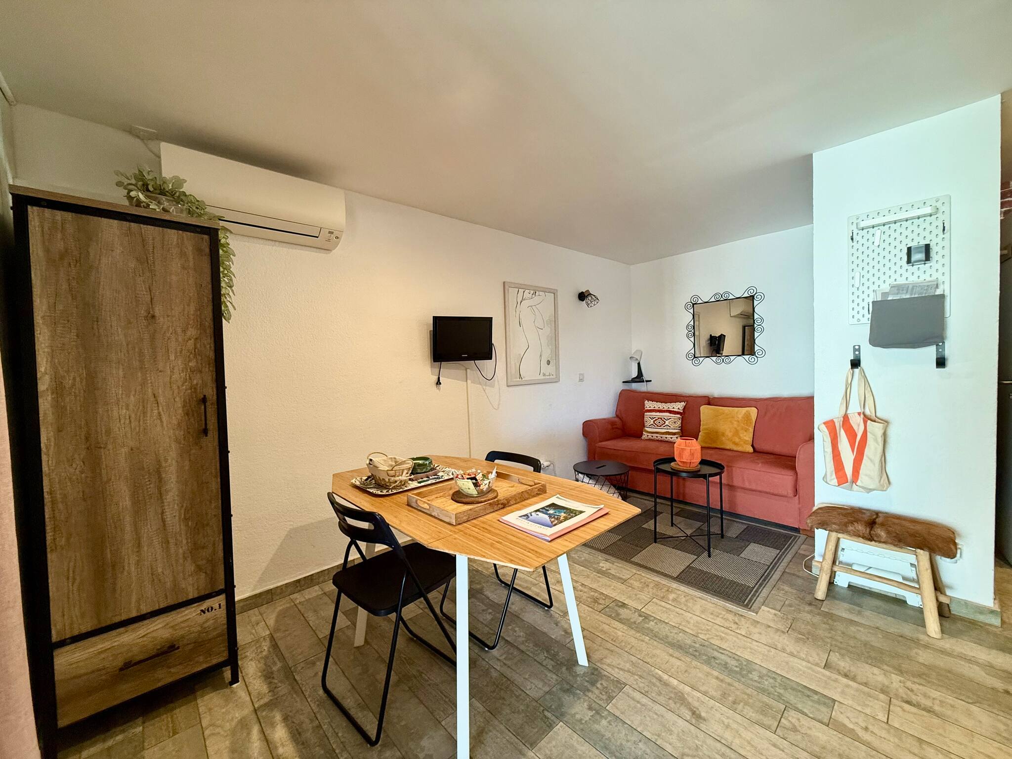 Le salon-séjour est baigné de lumière grâce à sa grande baie vitrée donnant sur le coin terrasse. Vous y trouverez un canapé convertible pour deux personnes, un coin repas convivial, et une télévision connectée pour vos soirées cocooning.