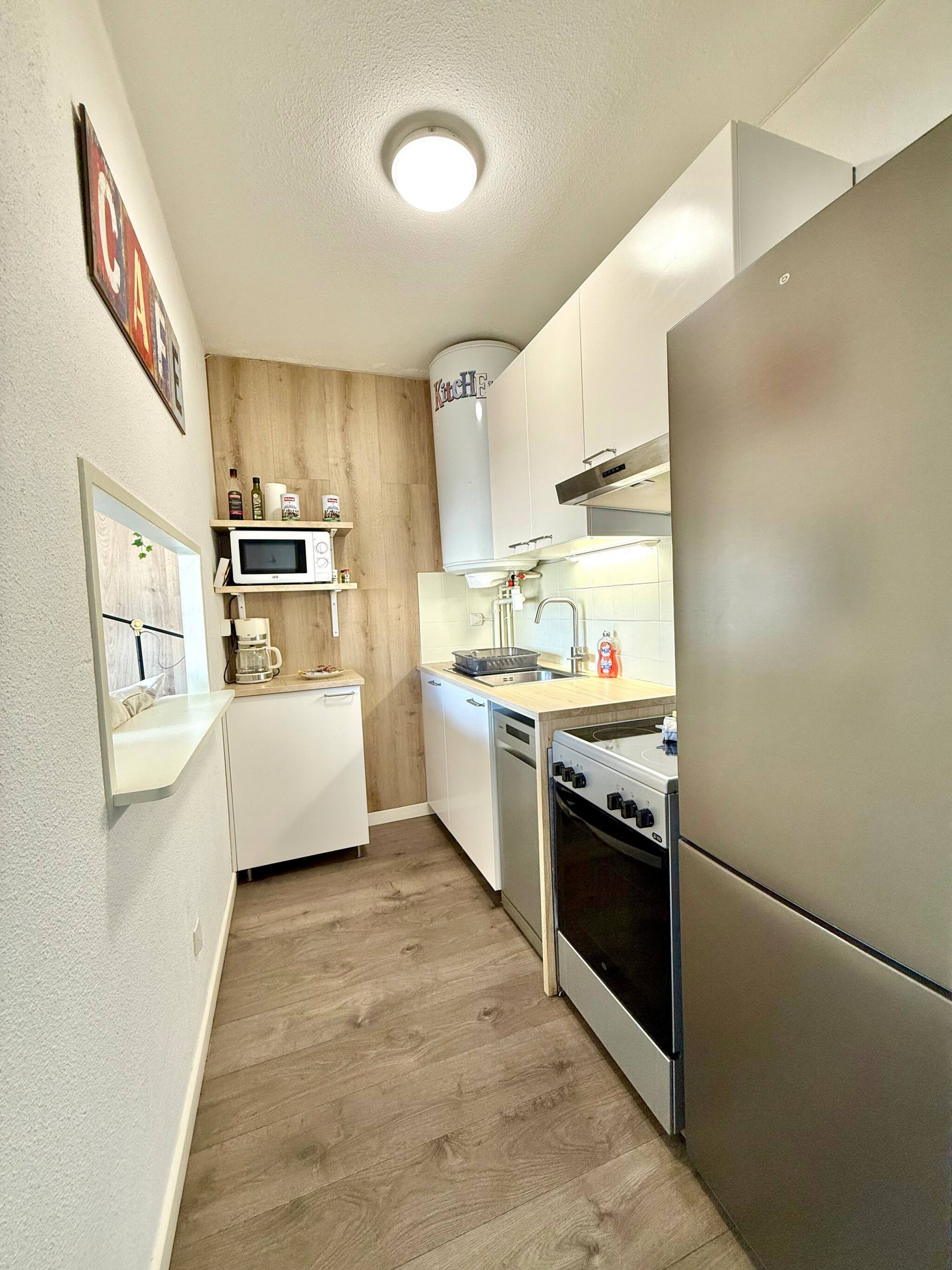 Ce charmant studio dispose d'une pièce à vivre avec coin télé et canapé convertible (120×190cm) et un coin cuisine équipée, avec frigidaire, four, plaque de cuisson, lave vaisselle, micro ondes, et machine à café à filtre. Vous avez également à disposition de la vaisselle et des ustensiles de cuisine pour vous concocter de bons petits repas.