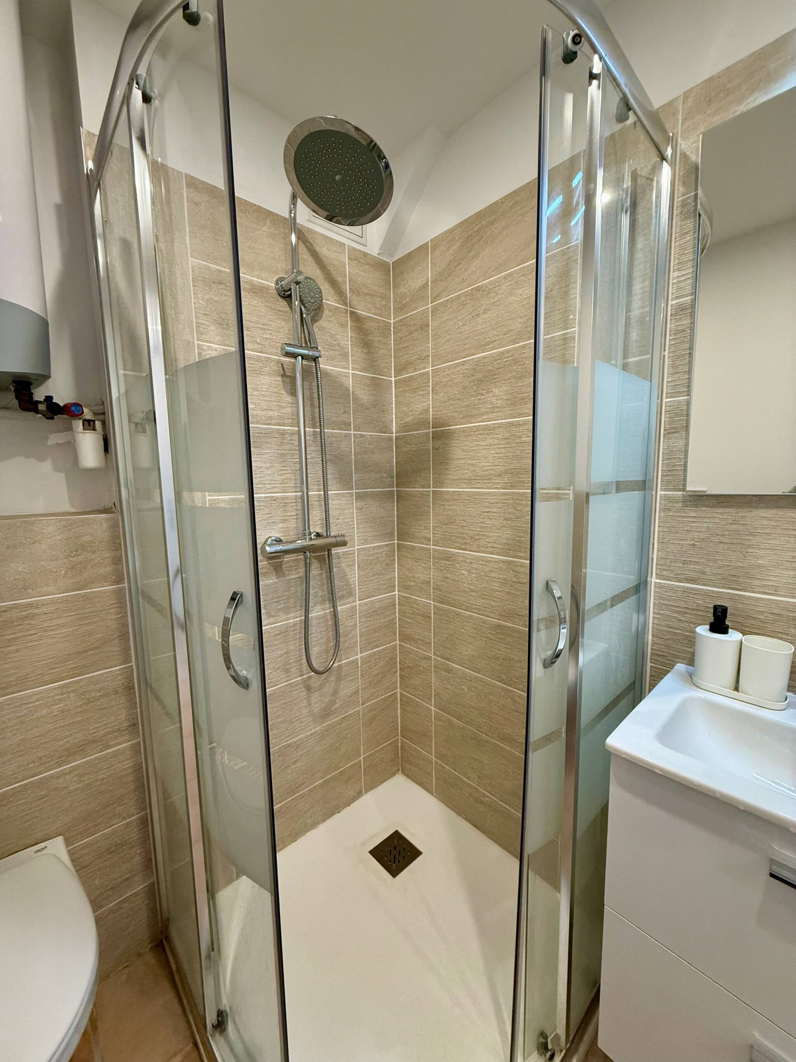 Salle d'eau avec douche, lavabo, et WC.