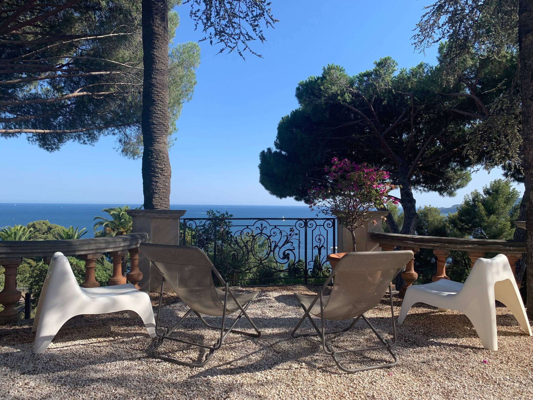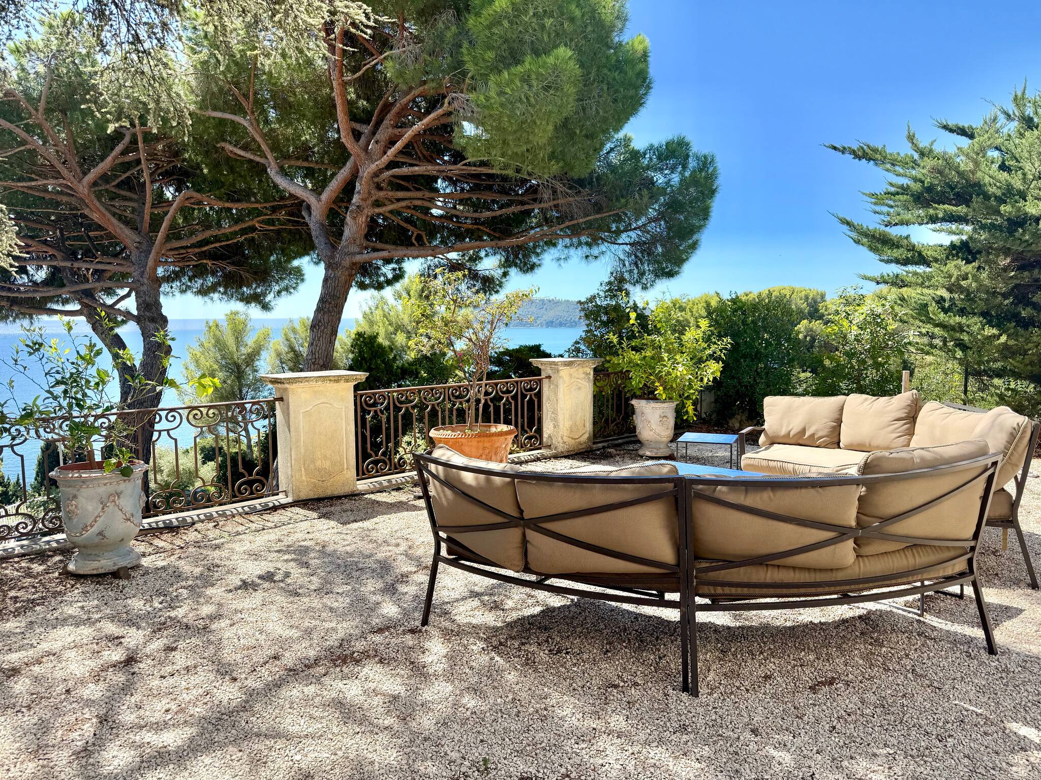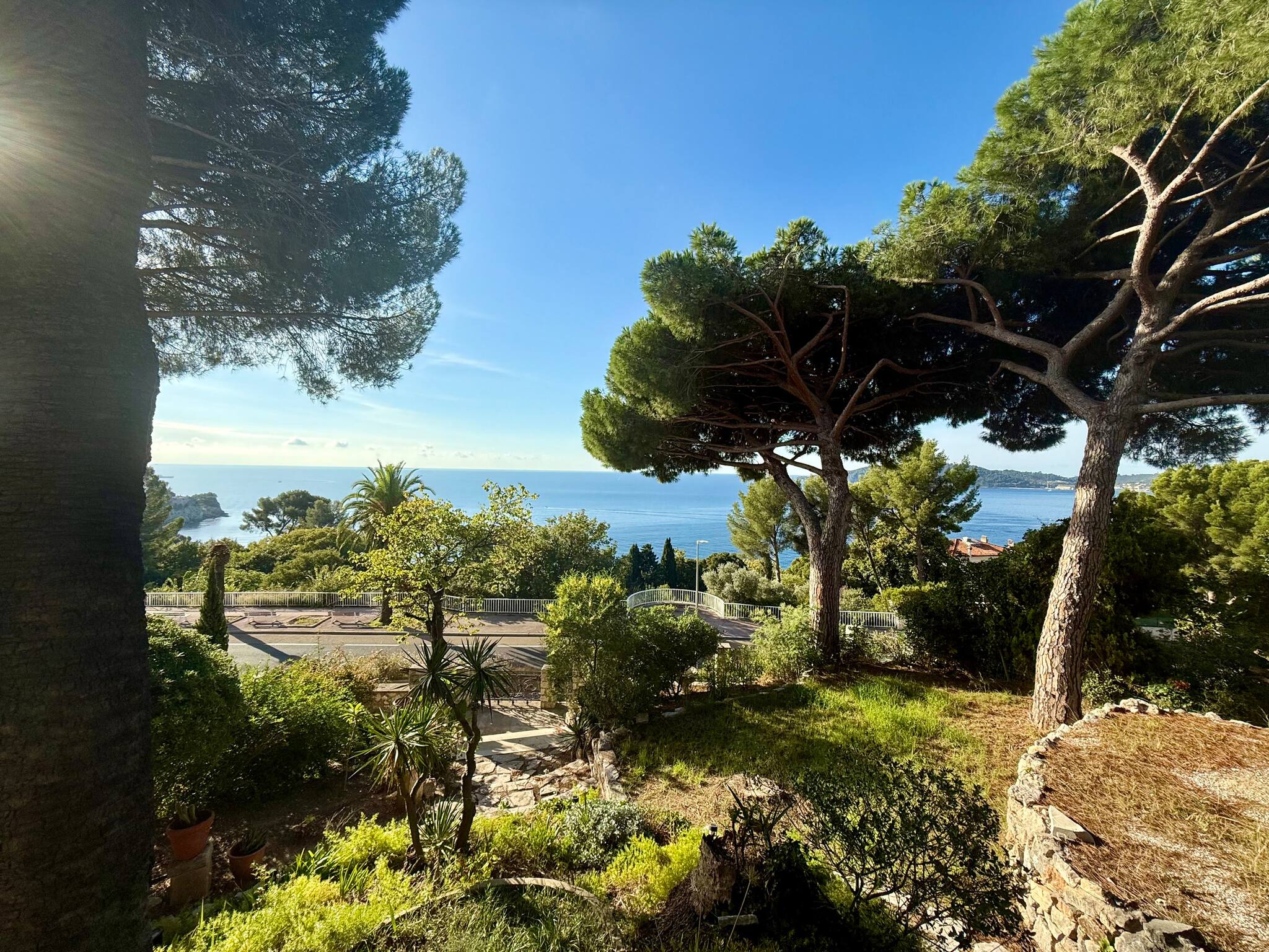 La villa est en hauteur et en retrait par rapport à la route de la corniche ce qui donne l'impression de surplomber la mer. L'environnement est urbain mais exclusivement résidentiel, sans nuisance, on est donc tranquille.