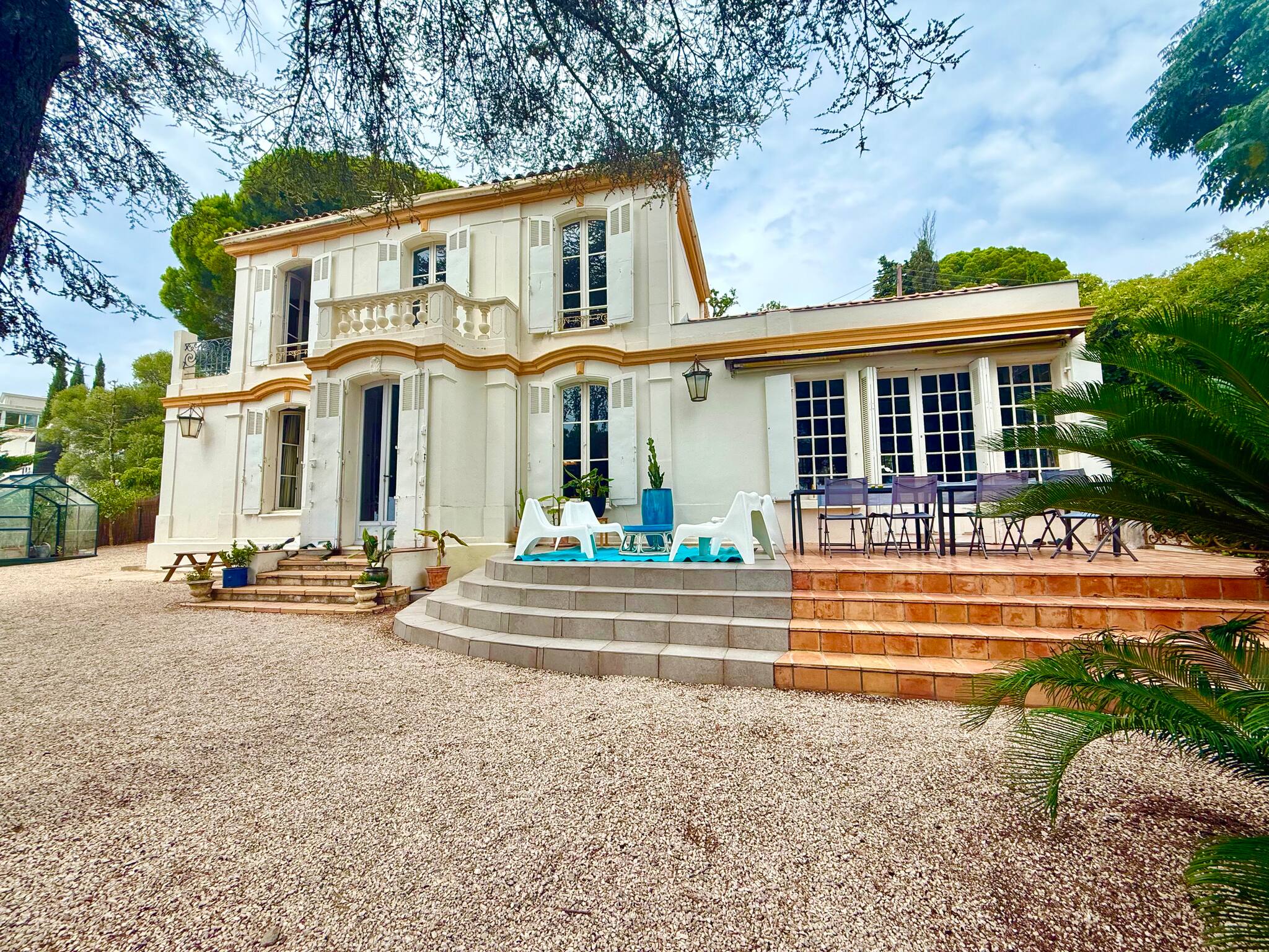 Il y a aussi un parking privé devant l'entrée de la maison et on peut aussi rentrer une voiture dans la propriété. Le jardin est en restanques, il y a donc des marches à monter pour arriver sur la terrasse de la maison.